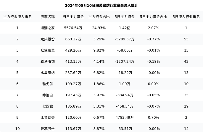 从主力资金流向来看,服装家纺行业今日主力资金流入5.33亿元,在所有申万二级行业中排名:129/131。
