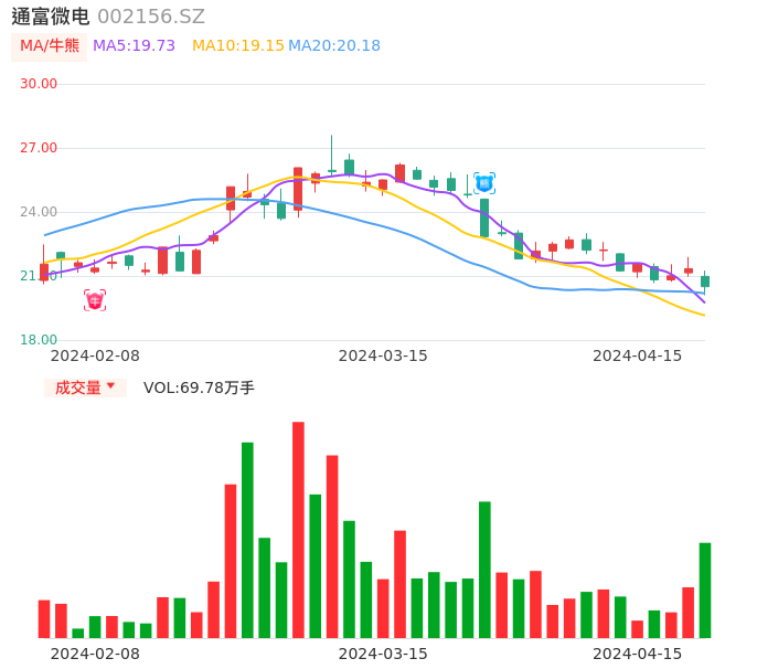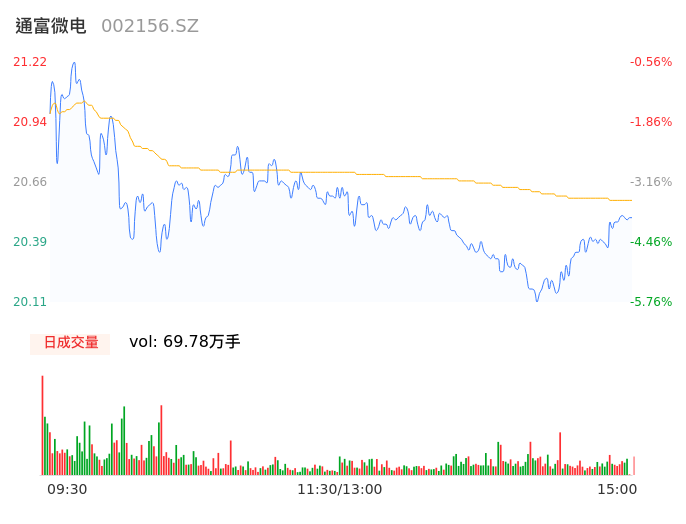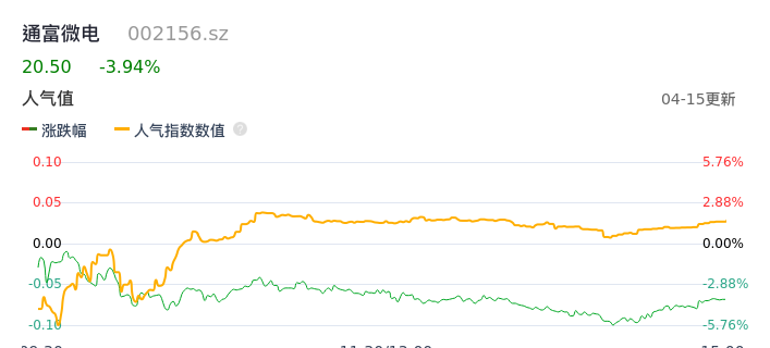 04月15日,通富微电收报20.50,股价涨幅-3.94%,成交金额14.36亿元,换手率4.60%。