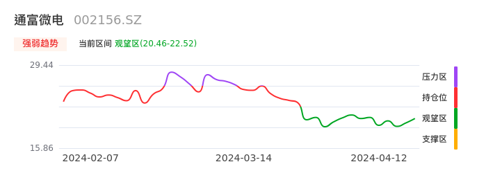 我们来看一下该股的九方特色指标强弱趋势的情况:通富微电自03月25日从持仓区下穿到观望区。股价近期持续下跌后,短期出现止跌迹象。后续重点关注能否再次站上多空分界点:22.52元。如未能有效突破则可能进入新一轮空头行情。