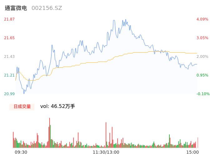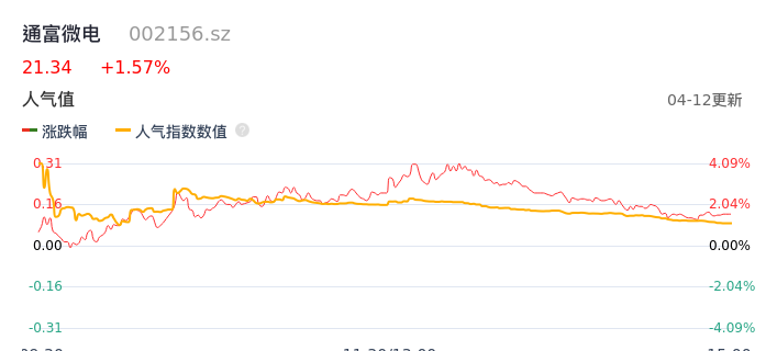 04月12日,通富微电收报21.34,股价涨幅1.57%,成交金额9.99亿元,换手率3.07%。