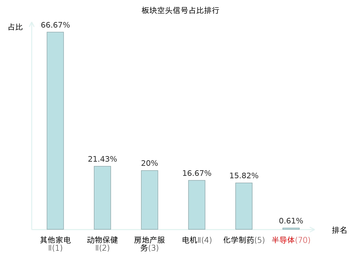 全市场所有行业板块中主力空头信号占比排名中,其他家电Ⅱ板块位居第一。家电零部件Ⅱ板块名次提升最快,较昨日上升110位。