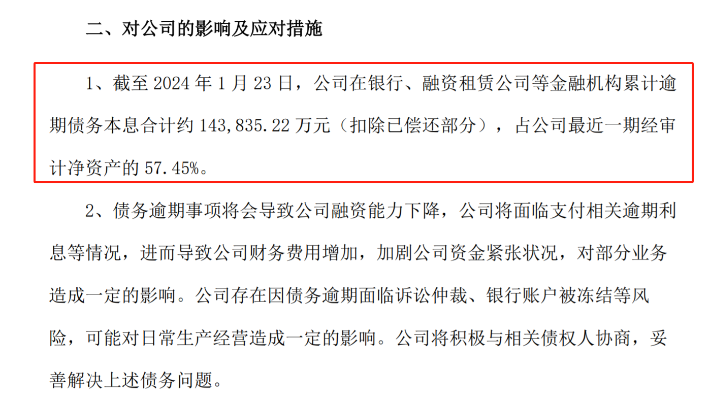 根据公告,截至2024年1月23日,该公司在金融机构新增逾期的债务本息合计约3.2亿元,占公司最近一期经审计净资产的12.76%。加上这笔新增逾期债务,傲农生物的银行、融资租赁公司逾期债务本息,合计约为14.38亿元(扣除已偿还部分),占最近一期经审计净资产的57.45%。