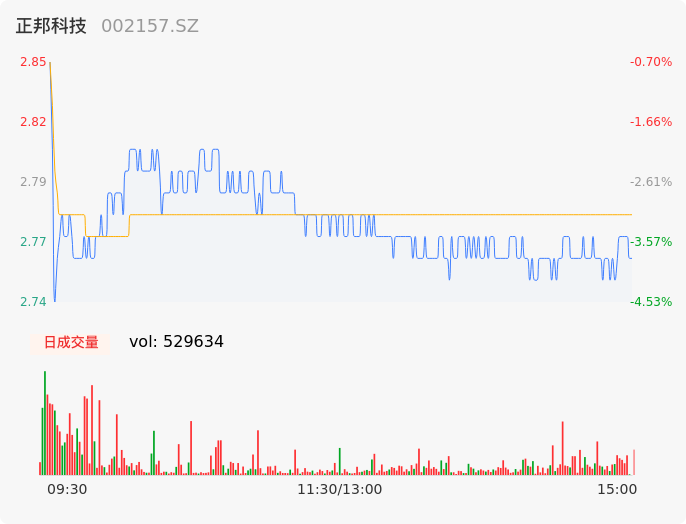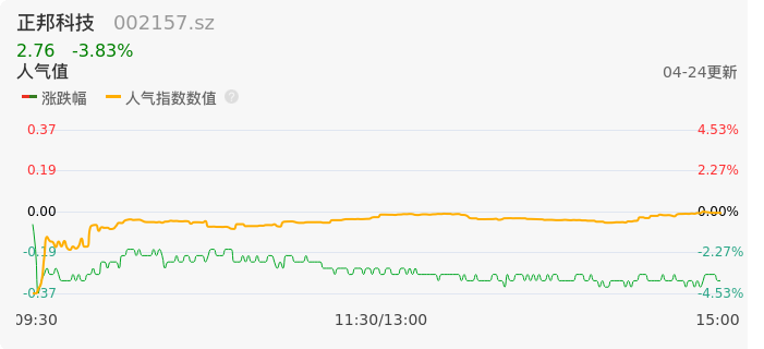 04月24日,正邦科技收报2.76,股价涨幅-3.83%,成交金额1.47亿元,换手率2.17%。