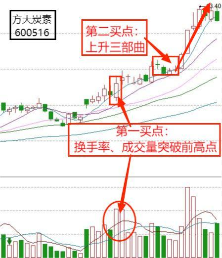 如图可以看出方大炭素在该阶段出现的上升三部曲买点,第一买点是基础的“长阳重炮”的形态,此时即可介入,同时经过几天的调整,再次出现的阳线是涨停或者T字线,成交量和换手率都高于第一个阳线可以获得更多的利润,即第二买点可再次买入,股价迅速拉升。