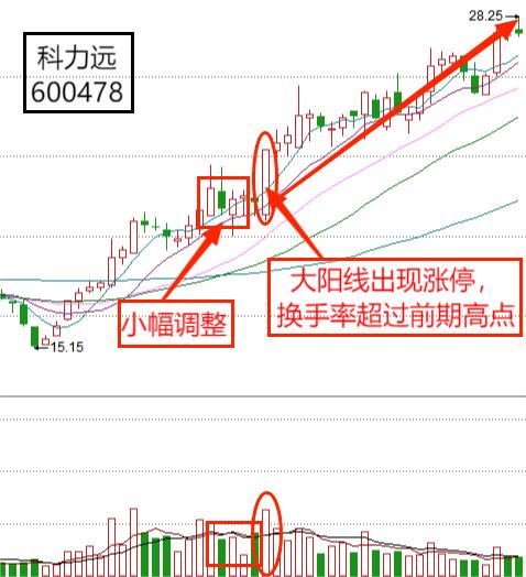 科力远的K线形态里“长阳重炮”形态不是特别完美,但也能看出的确是存在“长阳重炮”形态的,大阳线依旧存在,而且是最好的涨停状态,成交量小幅放大,突破新高后连续多个交易日收出上影线,但不跌破创新高交易日的开盘价,此后股价一路震荡上行。