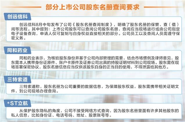上市公司提供股东名册的查阅方式也存在差异。一些上市公司表示,公司在核实股东身份等信息无误后就可以通过邮件或电话等提供。一位沪市上市公司董秘透露,各家公司的规定不一样,有的会让签署保密协议,有的可能不需要。