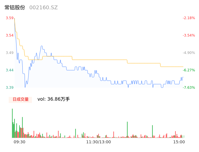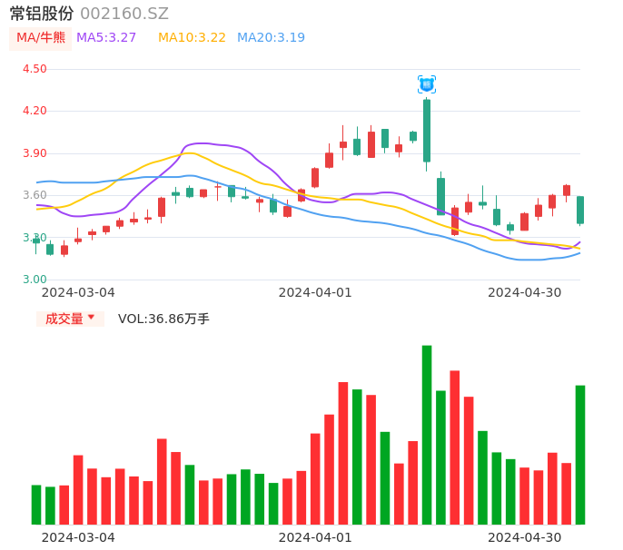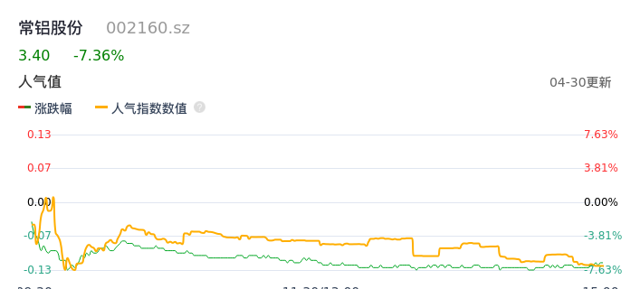 04月30日,常铝股份收报3.40,股价涨幅-7.36%,成交金额1.27亿元,换手率4.65%。