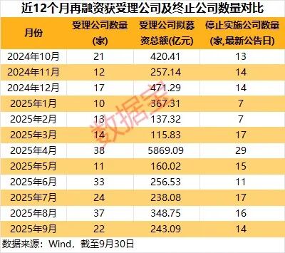 以最新公告日统计,9月份共有14家公司停止实施再融资,包括中科通达、远望谷、秦安股份等。远望谷表示,公司结合目前实际情况及未来发展规划等诸多因素的考虑,经与相关各方充分沟通及审慎分析后,现决定终止2025年度以简易程序向特定对象发行股票的相关事项。