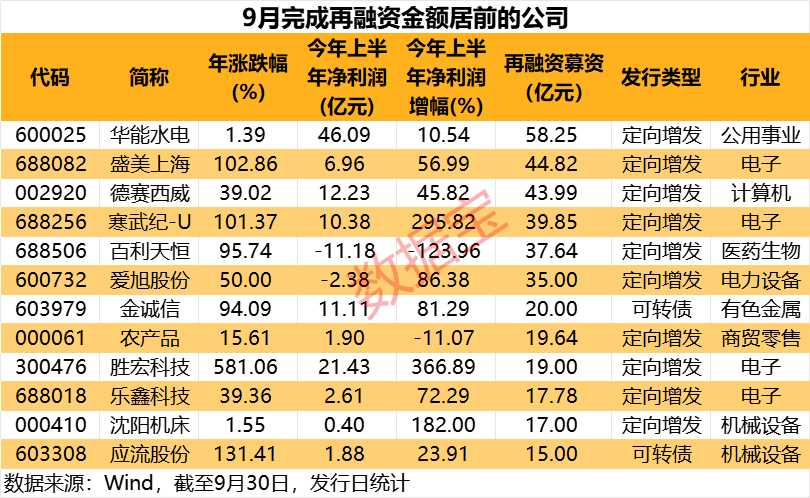 从单家公司来看,9月份完成再融资募资公司中,有12家公司完成募资超过15亿元,其中6家超过35亿元,依次有华能水电、盛美上海、德赛西威、寒武纪-U等。