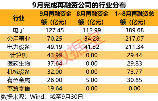 从申万一级行业来看,9月份,电子、公用事业、电力设备行业完成再融资额位居前三,其中电子行业再融资额超过127亿元,环比增加近13%;公用事业行业再融资额环比增加超过100%至70亿元以上;电力设备行业再融资额超过49亿元。