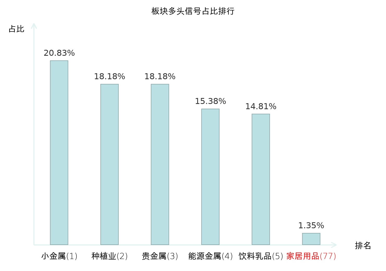 全市场所有行业板块中主力多头信号占比排名中,小金属板块位居第一。房屋建设Ⅱ板块名次提升最快,较昨日上升111位。