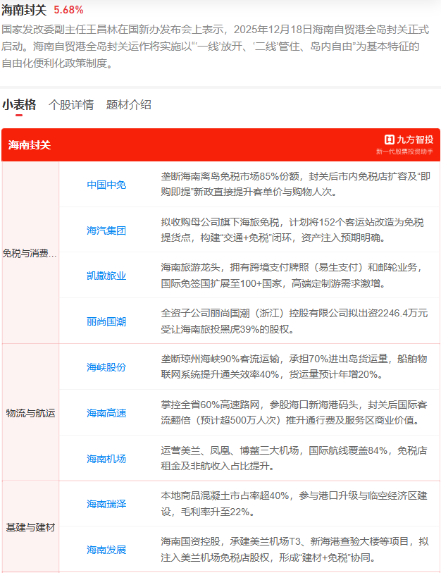 展望未来,国信证券表示,投资海南的主题从关注B2C消费转向关注B2B产业升级和高附加值服务业。重点关注三大核心投资逻辑:1.现代物流与贸易服务:基于“一线放开、二线管住”和“加工增值”免税规则,海南作为连接国内国际双循环的“亚洲新枢纽”地位将得以确立;2.高新技术与绿色能源:“15%所得税”的引力正沿着《2024年鼓励类产业目录》精准引导资本流向航天、深海、数字经济和绿色能源等战略性新兴产业;3.超越免税的“旅游+”:高附加值的医疗、会展、飞机维修(MRO)和国际教育等“工业级”服务业将接棒成为新的增长点。