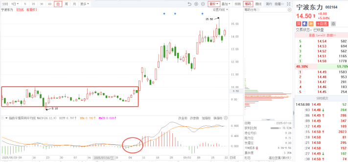 以宁波东力为例:25年8月,宁波东力因机器人概念受到市场关注。6月下旬以来到8月初,宁波东力股价在 8.8-10 元区间形成明显的单峰密集筹码区,筹码集中度达 90%,且MACD指标在零轴上方形成金叉。