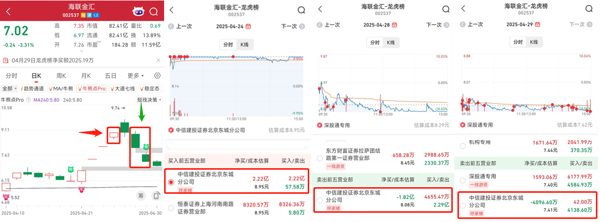 呼家楼被股民们冠以外号“首富”,近期大手笔介入电力中军韶能股份、跨境支付中军海联金汇,上周五买入韶能股份1.5亿,海联金汇2.2亿,均买在了最高点,本周两天陆续割肉。最新的龙虎榜更显示其卖出2.7亿,几乎已经清仓。