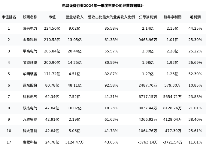 惠程科技最新报告期数据为一季度,下表汇总了电网设备行业内市值靠前的公司一季度主要经营数据