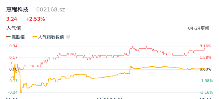 04月24日,惠程科技收报3.24,股价涨幅2.53%,成交金额2355.39万元,换手率0.94%。