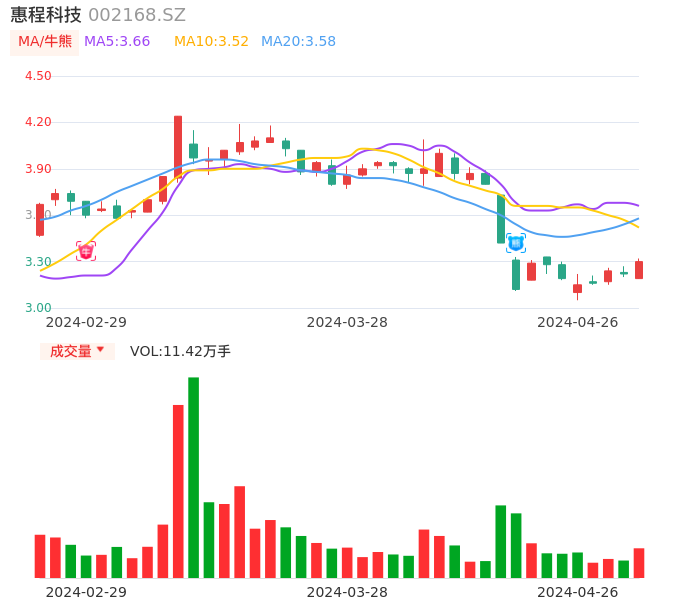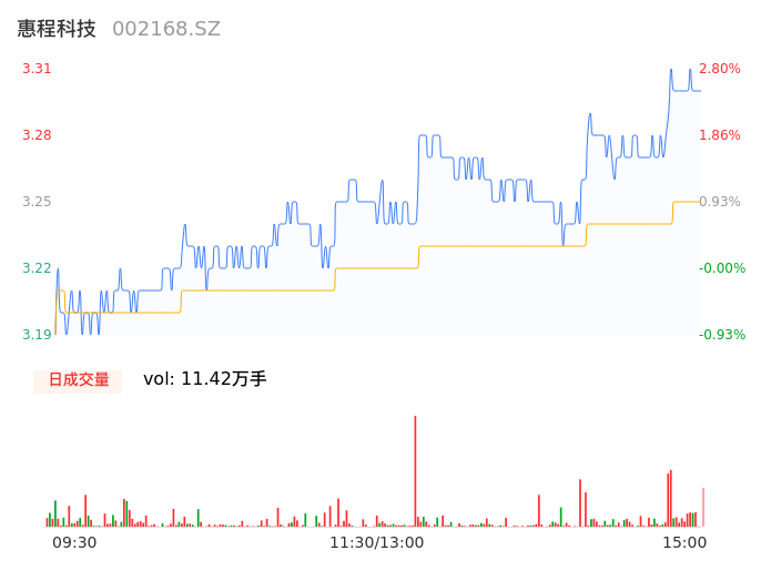 04月26日,惠程科技收报3.30,股价涨幅2.48%,成交金额3712.23万元,换手率1.46%。
