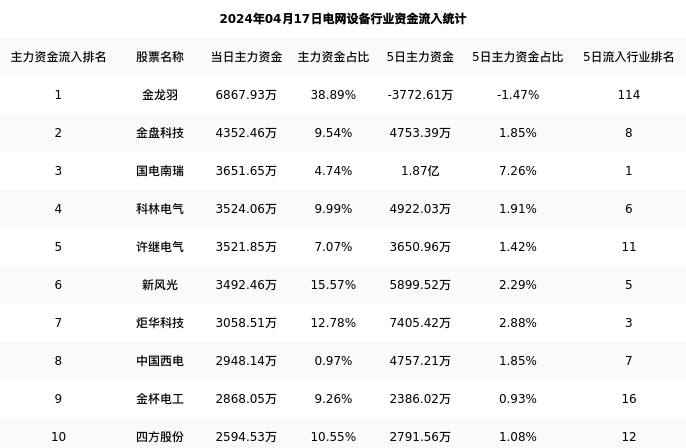 从主力资金流向来看,电网设备行业今日主力资金流入48.96亿元,在所有申万二级行业中排名:29/131。