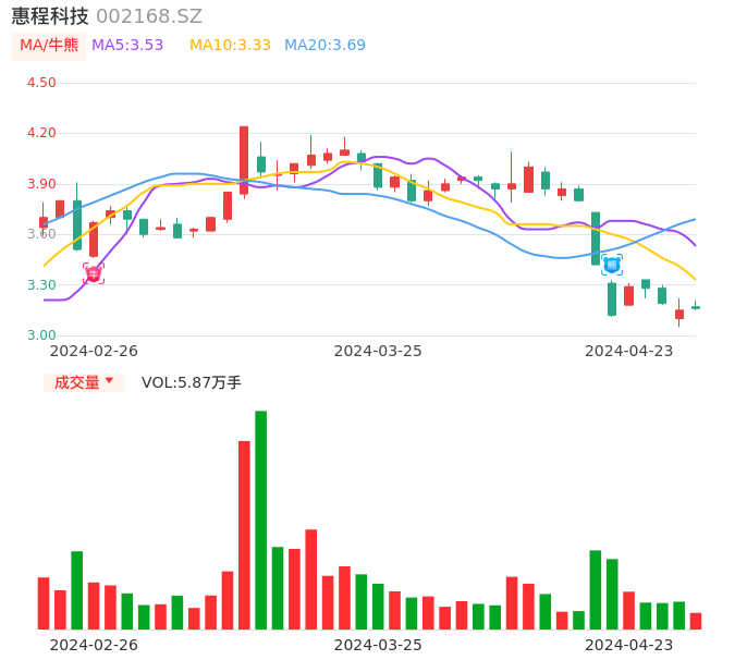 04月23日,惠程科技收报3.16,股价涨幅0.32%,成交金额1864.39万元,换手率0.75%。