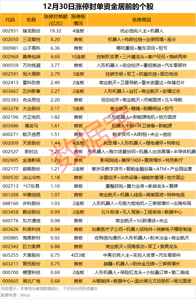以封单金额计算,21股封单金额均超1亿元,锋龙股份、三花智控、山子高科涨停板封单资金居前,分别有19.32亿元、8.2亿元、6.36亿元。