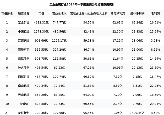 楚江新材最新报告期数据为一季度,下表汇总了工业金属行业内市值靠前的公司一季度主要经营数据