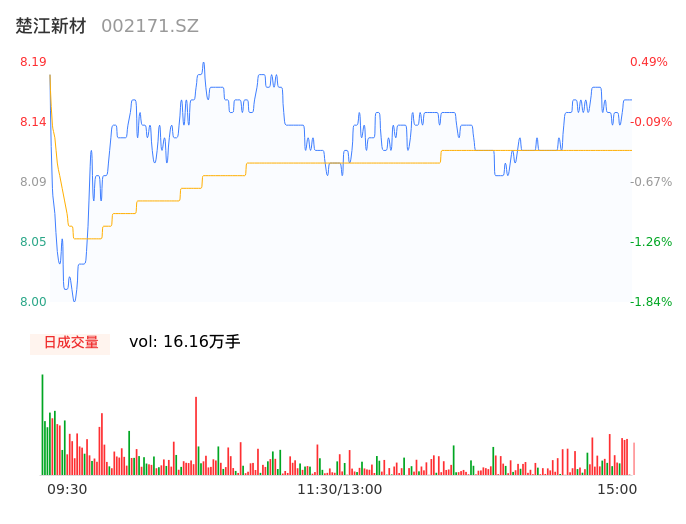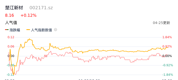04月25日,楚江新材收报8.16,股价涨幅0.12%,成交金额1.31亿元,换手率1.25%。