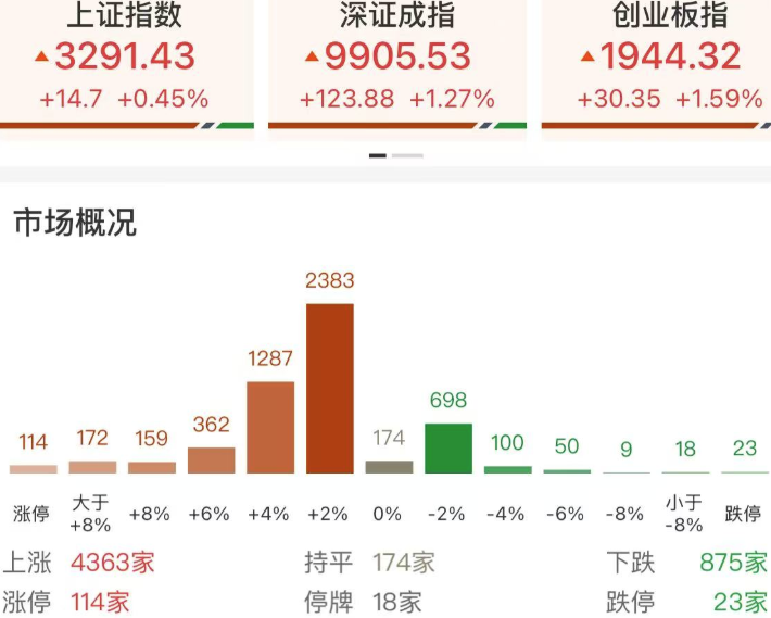 市场全天低开后震荡反弹,创业板指领涨,沪指录得7连阳。沪深两市全天成交额1.04万亿,较上个交易日放量1267亿。盘面上,黄金股集体大涨,四川黄金等10余股涨停;大消费股再度活跃,电商、影视等方向领涨,机器人、算力等概念股展开反弹;截至收盘,沪指涨0.45%,深成指涨1.27%,创业板指涨1.59%。涨跌幅方面,黄金、电商、机器人、影视等板块涨幅居前,银行、白酒、港口等板块跌幅居前。