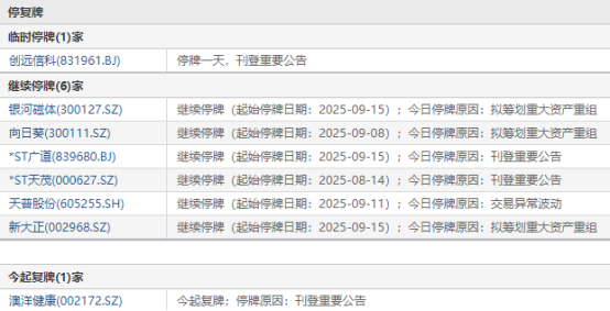上证报中国证券网讯 9月16日,1家公司临停:创远信科,1家公司复牌:澳洋健康。