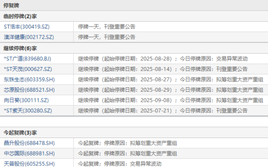 上证报中国证券网讯 9月9日,2家公司临停:ST浩丰、澳洋健康,3家公司复牌:晶升股份、中芯国际、天普股份。