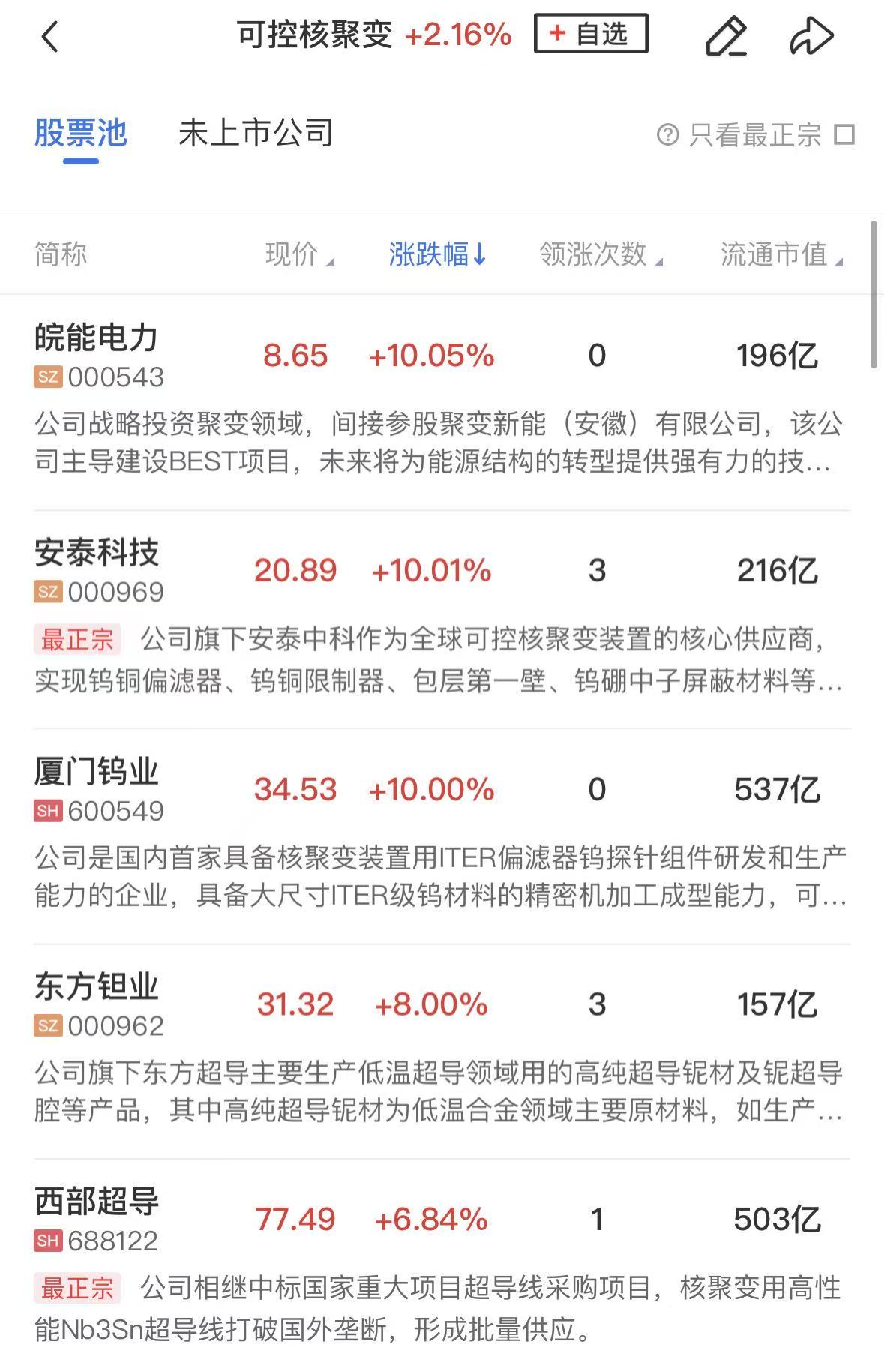 可控核聚变概念股震荡走强,安泰科技、厦门钨业涨停,东方钽业创历史新高,西部超导、斯瑞新材、中国核建涨幅居前。