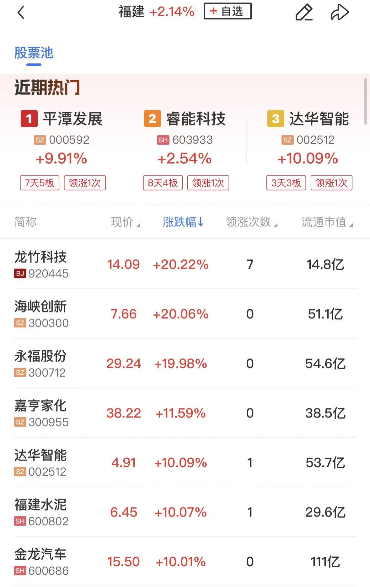 此外,福建本地股于盘中异动拉升,海峡创新、永福股份双双20cm涨停,平潭发展7天5板,达华智能、漳州发展、中国武夷同样涨停。
