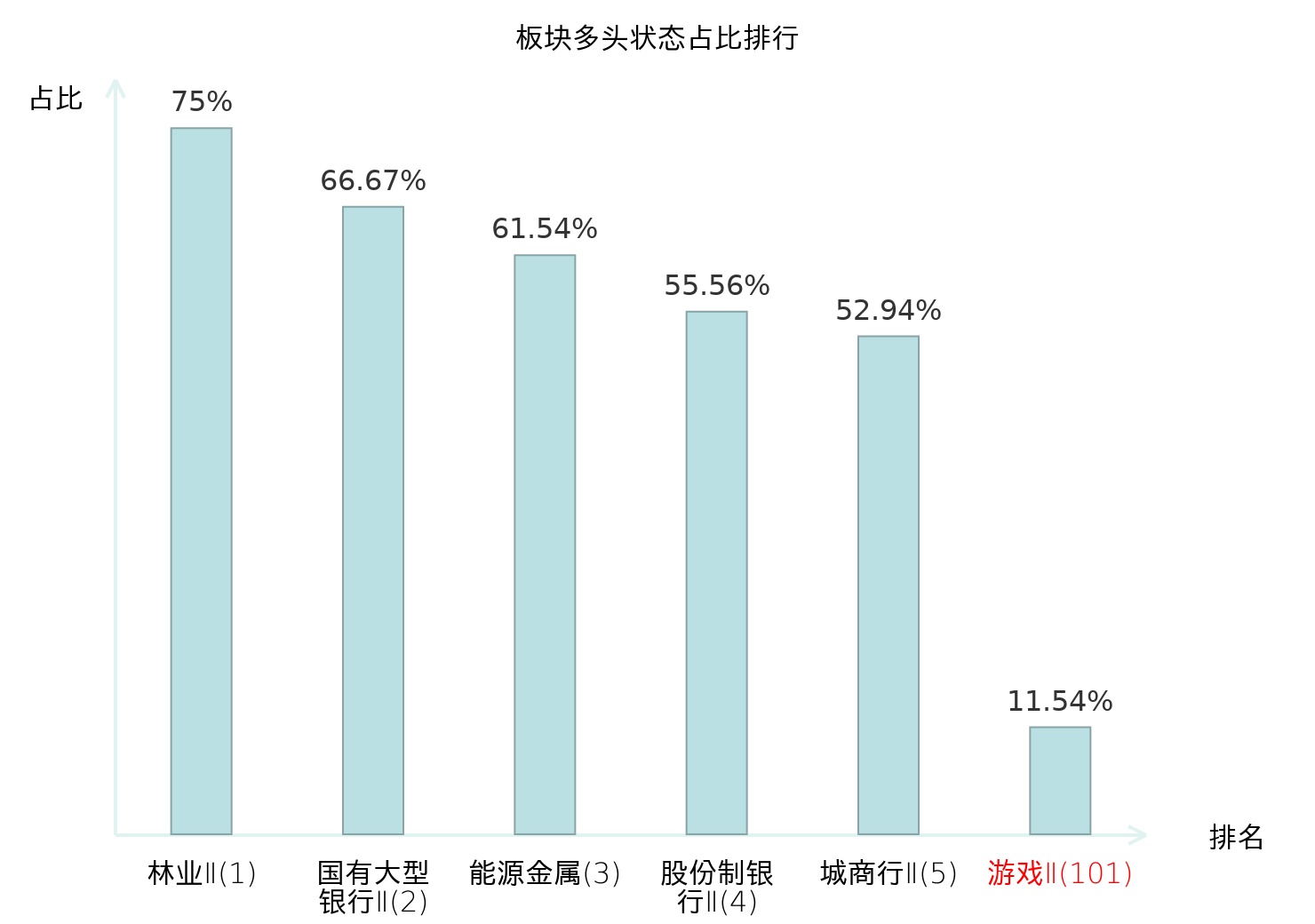 全市场所有行业板块中主力多头状态占比排名中,林业Ⅱ板块位居第一。动物保健Ⅱ板块名次提升最快,较昨日上升82位。