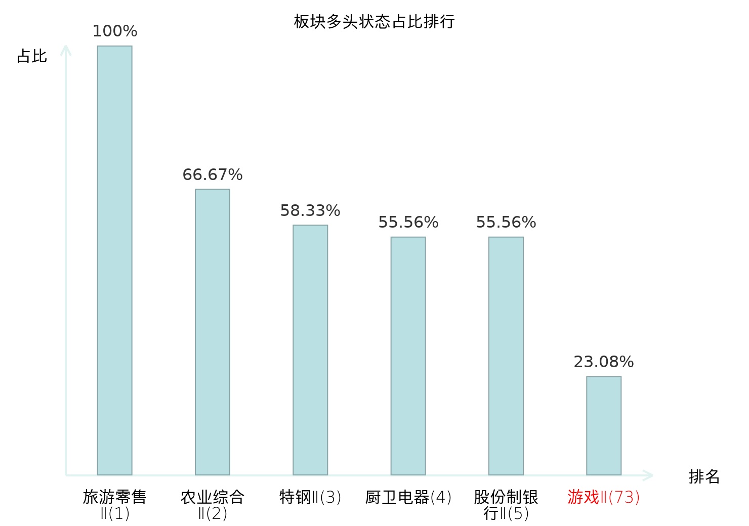 全市场所有行业板块中主力多头状态占比排名中,旅游零售Ⅱ板块位居第一。农业综合Ⅱ板块名次提升最快,较昨日上升127位。