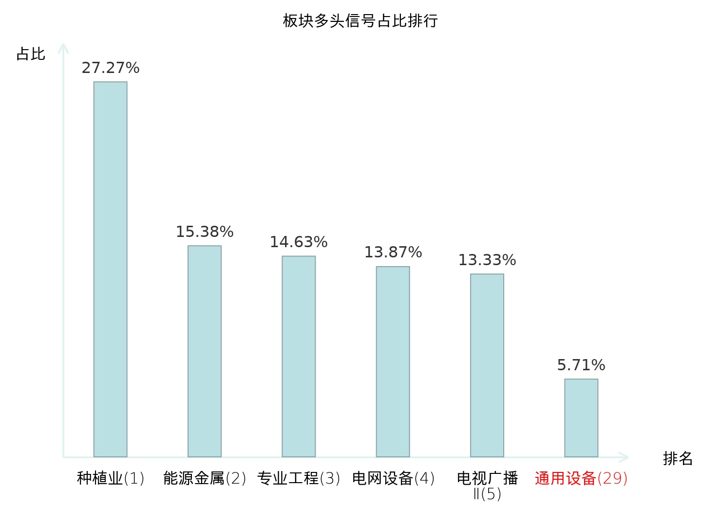 全市场所有行业板块中主力多头信号占比排名中,种植业板块位居第一。航海装备Ⅱ板块名次提升最快,较昨日上升106位。
