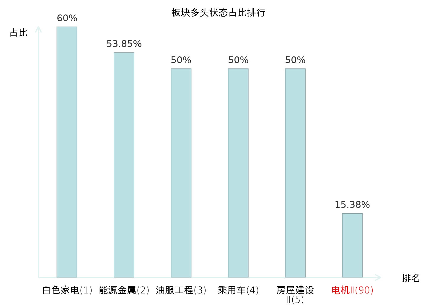 全市场所有行业板块中主力多头状态占比排名中,白色家电板块位居第一。油气开采Ⅱ板块名次提升最快,较昨日上升45位。