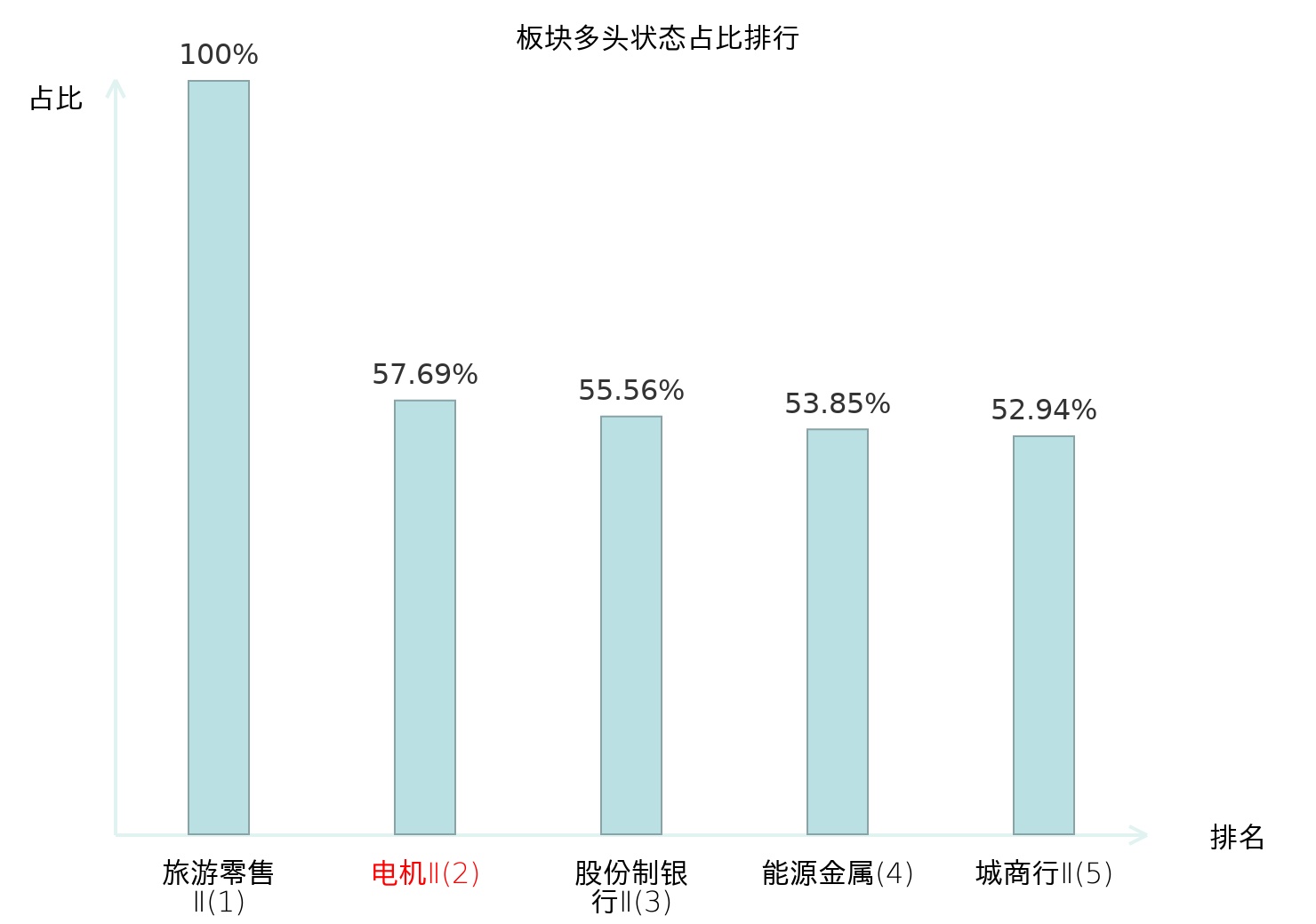 全市场所有行业板块中主力多头状态占比排名中,旅游零售Ⅱ板块位居第一。地面兵装Ⅱ板块名次提升最快,较昨日上升99位。