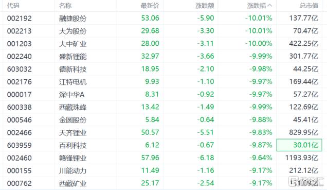 截至发稿,A股融捷股份、大为股份、盛新锂能、江特电机等跌停,天齐锂业、赣锋锂业、西藏矿业、西藏珠峰等大超9%。
