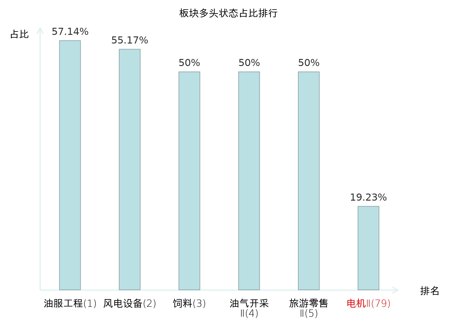 全市场所有行业板块中主力多头状态占比排名中,油服工程板块位居第一。非金属材料Ⅱ板块名次提升最快,较昨日上升67位。