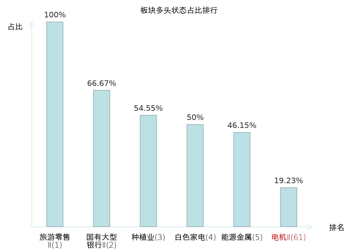 全市场所有行业板块中主力多头状态占比排名中,旅游零售Ⅱ板块位居第一。食品加工板块名次提升最快,较昨日上升57位。