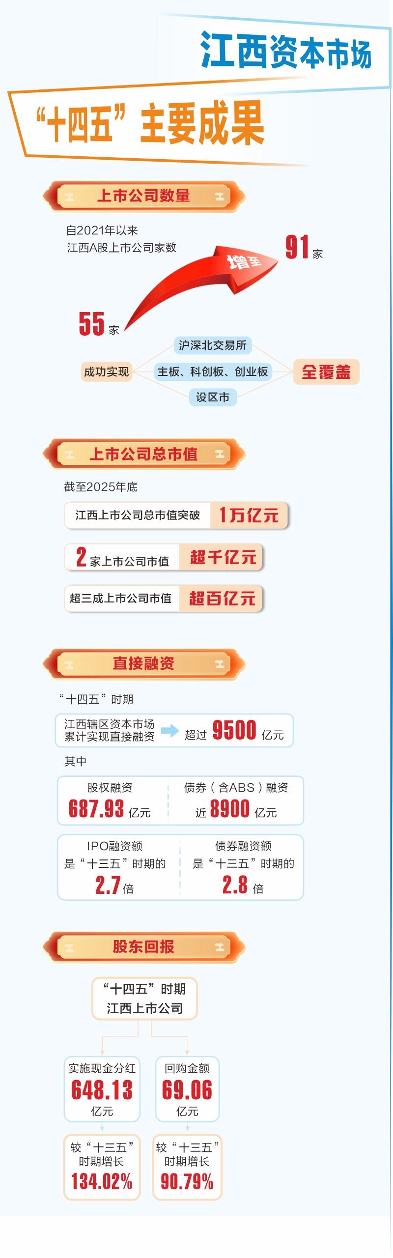 近五年,江西上市公司实施现金分红648.13亿元、回购金额69.06亿元,分别较“十三五”时期增长134.02%、90.79%。