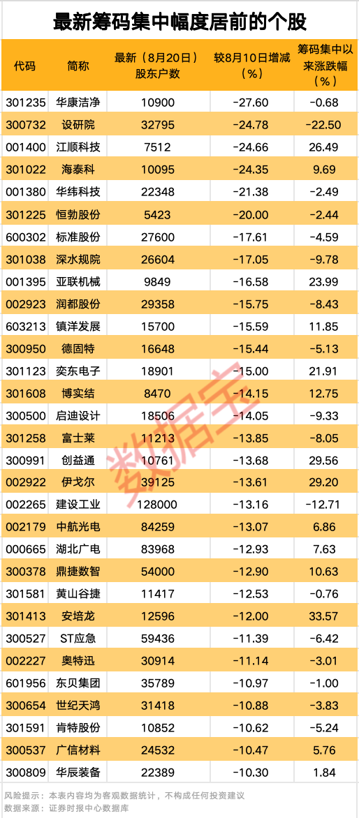 股东户数降幅最多的是华康洁净,截至8月20日最新股东户数为10900户,较8月10日下降27.6%,筹码集中以来该股累计下跌0.68%,累计换手率为156.53%。业绩方面,公司上半年实现净利润1868.3万元,同比增长273.48%。