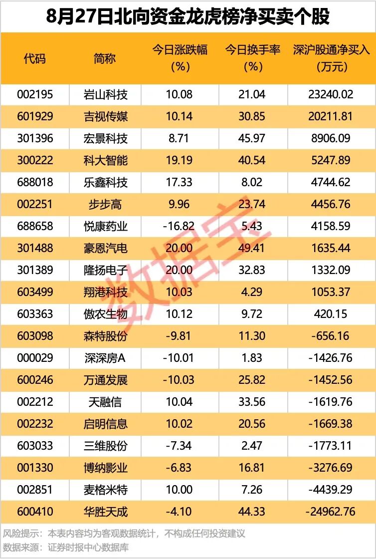今日龙虎榜现身个股中,11股获北向资金净买入,其中2股净买入金额均超2亿元。净买入居首的是岩山科技,金额为2.32亿元;吉视传媒、宏景科技、科大智能分别获净买入2.02亿元、8906.09万元、5247.89万元。