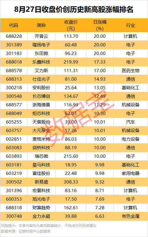 收盘价创历史新高股中,今日股价平均上涨6.7%,涨停的有开普云、东田微、隆扬电子等。