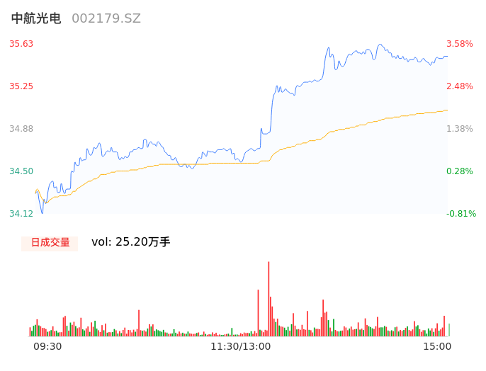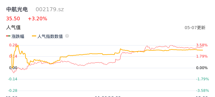 05月07日,中航光电收报35.50,股价涨幅3.20%,成交金额8.83亿元,换手率1.22%。