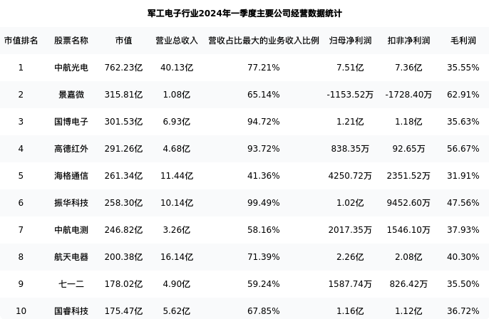 中航光电最新报告期数据为一季度,下表汇总了军工电子行业内市值靠前的公司一季度主要经营数据