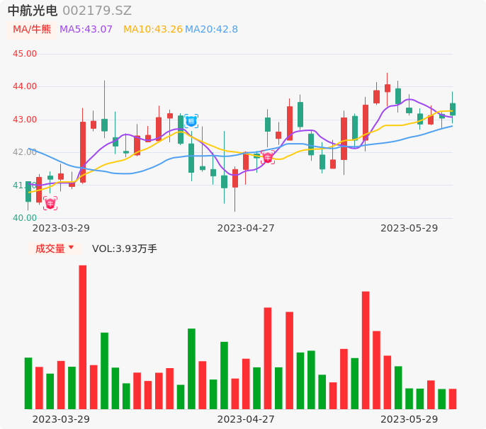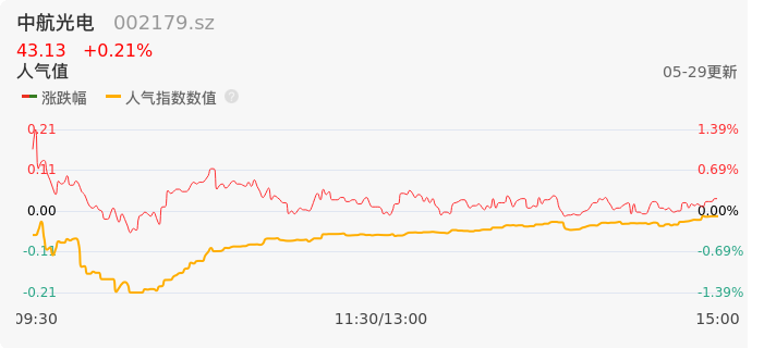05月29日,中航光电收报43.13,股价涨幅0.21%,成交金额1.70亿元,换手率0.19%。