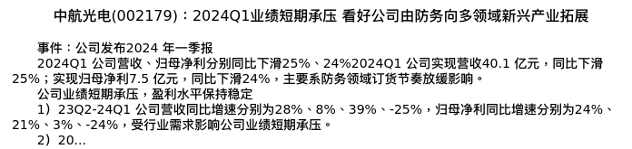 值得注意的是:2024年05月浙商证券的王华君/刘村阳分析师,首次发布关于中航光电的研究报告,标题为:中航光电(002179):2024Q1业绩短期承压 看好公司由防务向多领域新兴产业拓展。