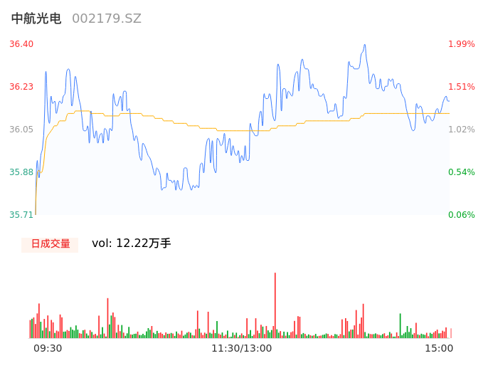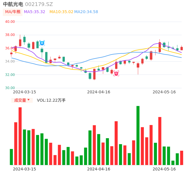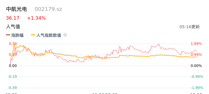 05月16日,中航光电收报36.17,股价涨幅1.34%,成交金额4.42亿元,换手率0.59%。