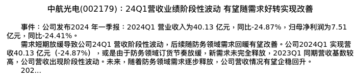 值得注意的是:2024年04月东方证券的王天一/罗楠/冯函分析师,首次发布关于中航光电的研究报告,标题为:中航光电(002179):24Q1营收业绩阶段性波动 有望随需求好转实现改善。
