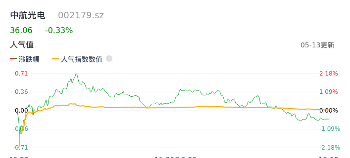 05月13日,中航光电收报36.06,股价涨幅-0.33%,成交金额5.19亿元,换手率0.69%。